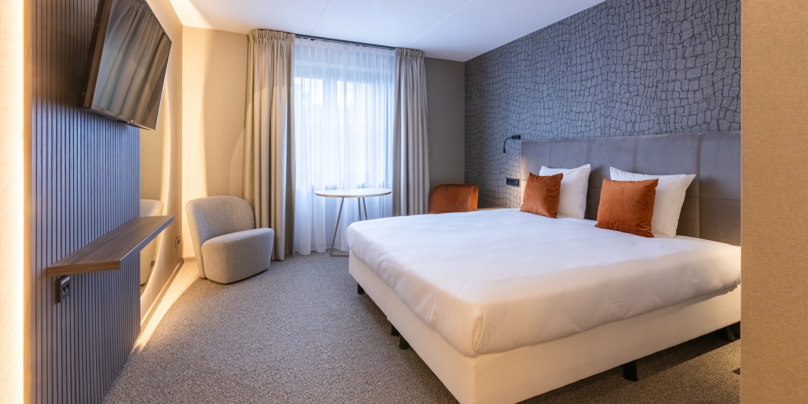 Enjoy extra space and comfort in our Royale rooms. These stylish rooms are larger than the Comfort rooms and offer a double bed or twin beds. The modern bathroom is equipped with a bath or shower. You also benefit from various amenities, such as a coffee machine, kettle, air conditioning, LCD TV, desk, seating area and free Wi-Fi.